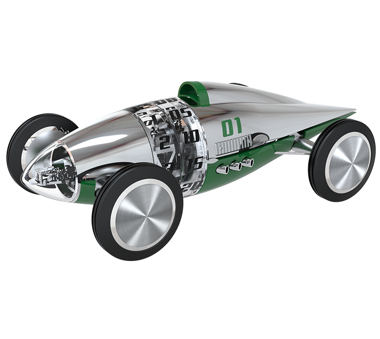 Rolling the piece backwards (rotating the rear wheels) winds the movement, like a pullback car.