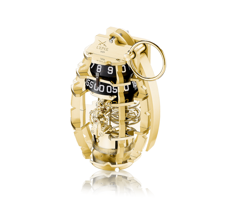 Grenade is modelled after the historical MKII grenade with an M6A4C fuse that uses a pin that is pulled to activate the explosive. In a similar way, the L’Epée 1839 Grenade features a pin that doubles as the key, which when pulled allows for setting the time and winding the eight-day movement. The moment you pull the pin on a grenade the mind is focused: the grenade is live, and you must concentrate on the here and now to survive.
