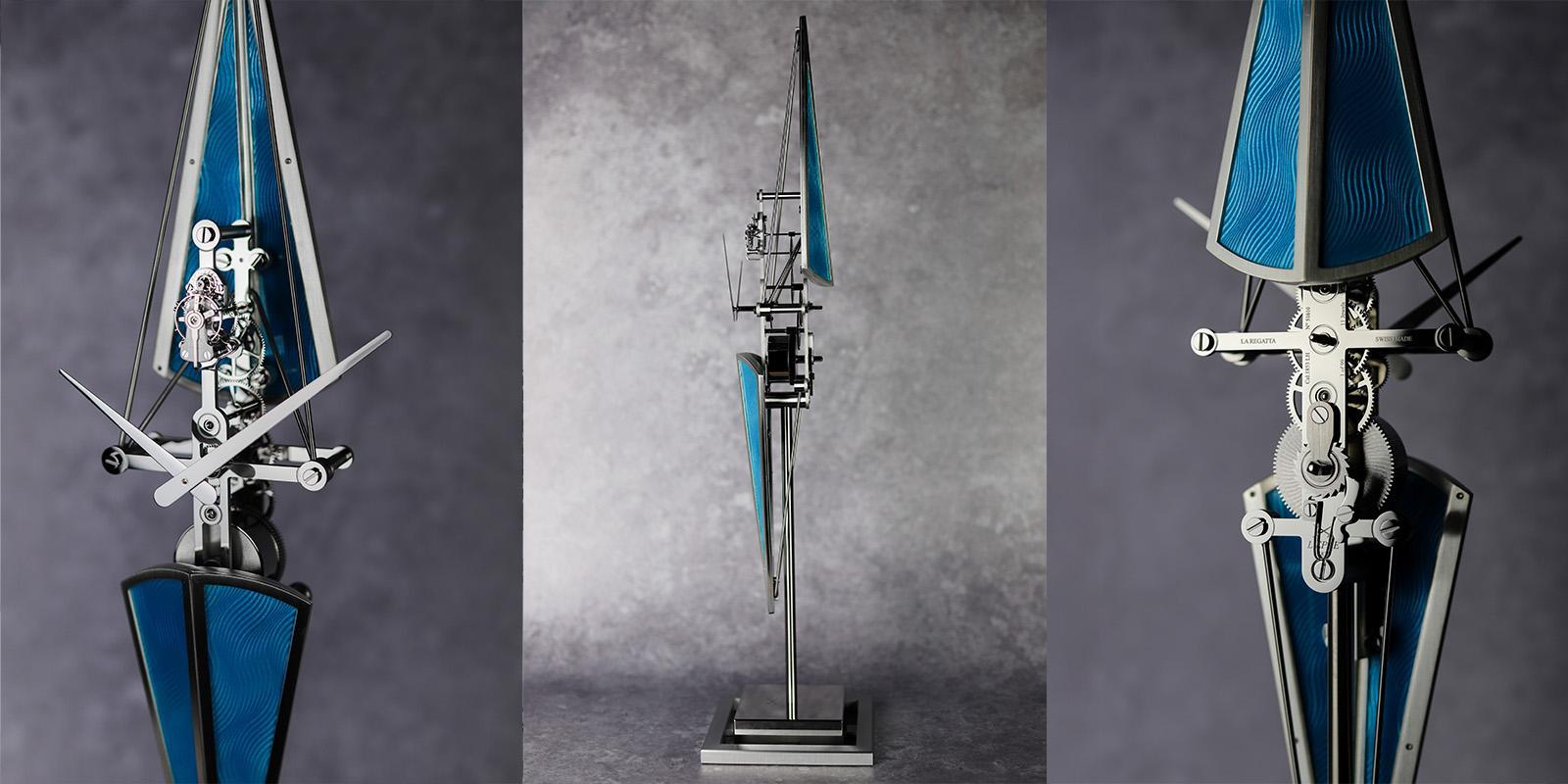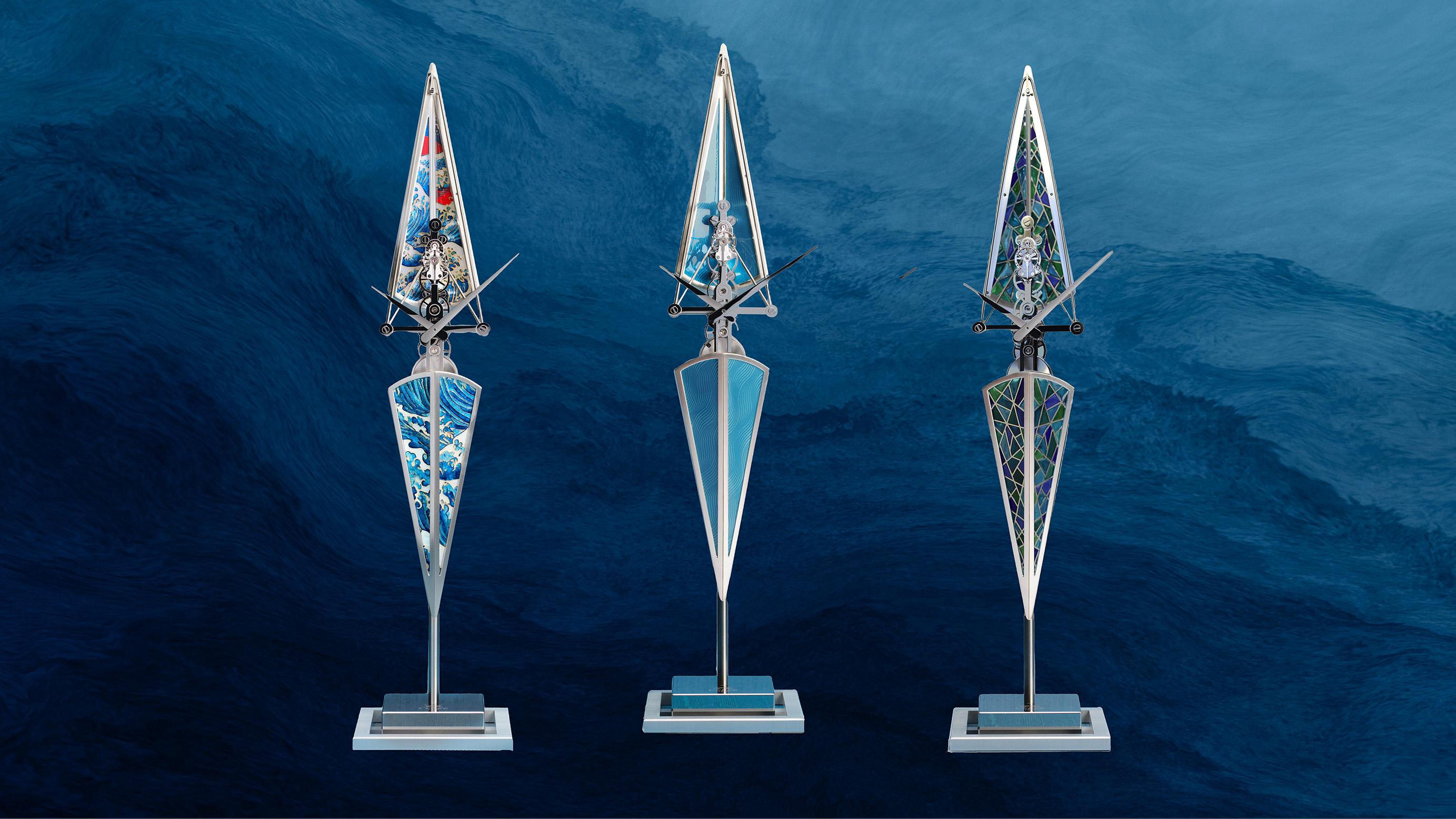 In this interpretation of La Regatta, prism pattern introduces a dynamic, almost mosaic-like rhythm that contrasts with the clock’s pure, vertical architecture. Applied using the plique-à-jour enameling technique, the interplay of deep blues and greens evokes shifting reflections on water, while the structured geometry echoes both the precision of the sport and the rigour of mechanical engineering. The technique adds a vibrant, expressive dimension to the piece, while preserving its inherent sense of balance and discipline.