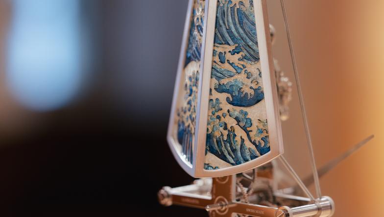 Inspired by the waves depicted in Japanese master Hokusai’s paintings, this piece features finely executed cloisonné enamel enhanced by the paillons technique, consisting of thin silver leaves inlaid in the background, capturing the rhythmic movement and power of the sea. The detailed cloisonné enamel work evokes waves rising and breaking, telling the story of La Regatta facing the elements head-on and translating the clock’s inherent elegance into a dynamic maritime expression.